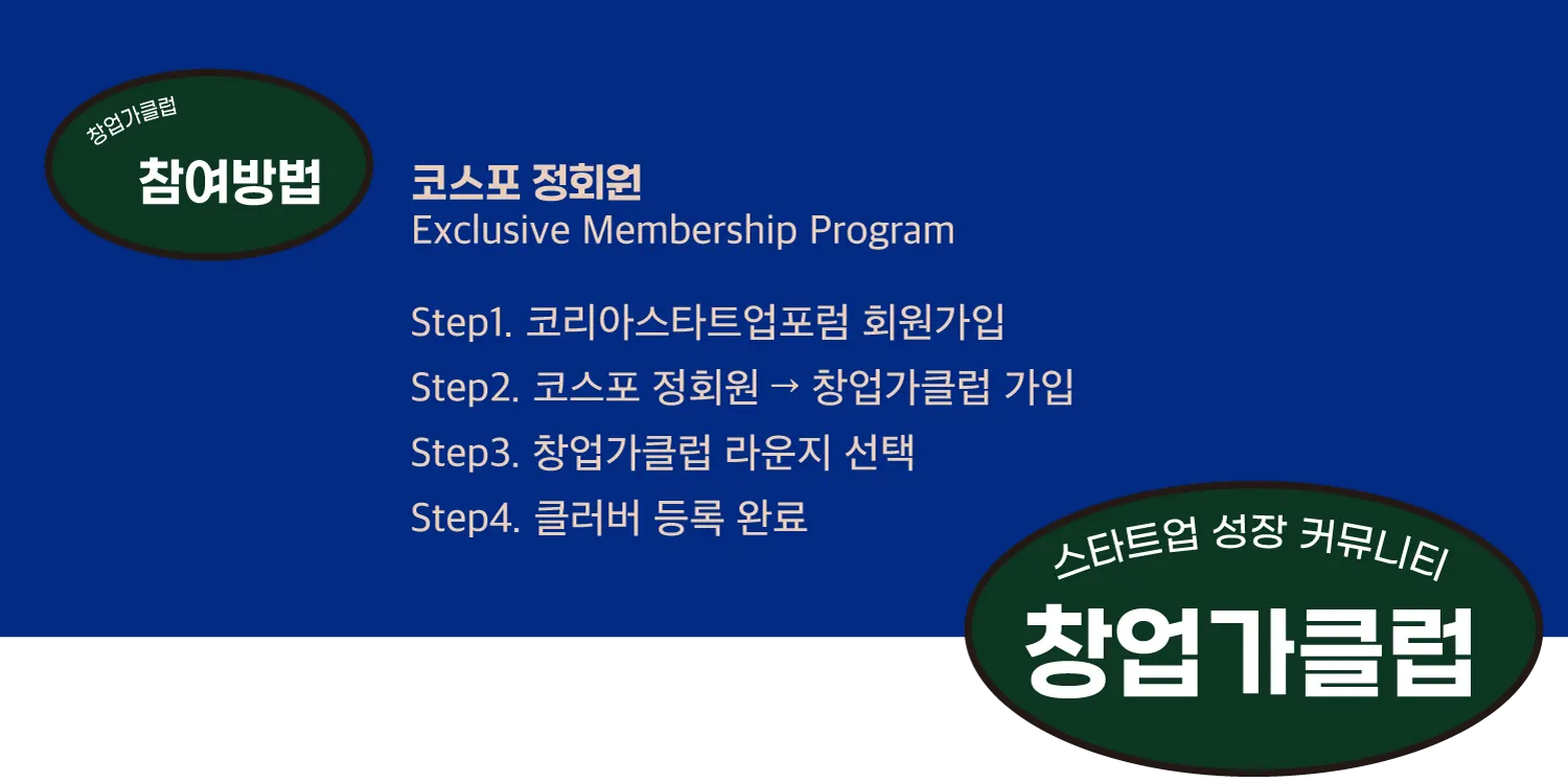 코스포의 성장단계별 맞춤형 지원과 특별 교류를 원하는 창업가라면 창업가클럽에 가입해 주세요!
