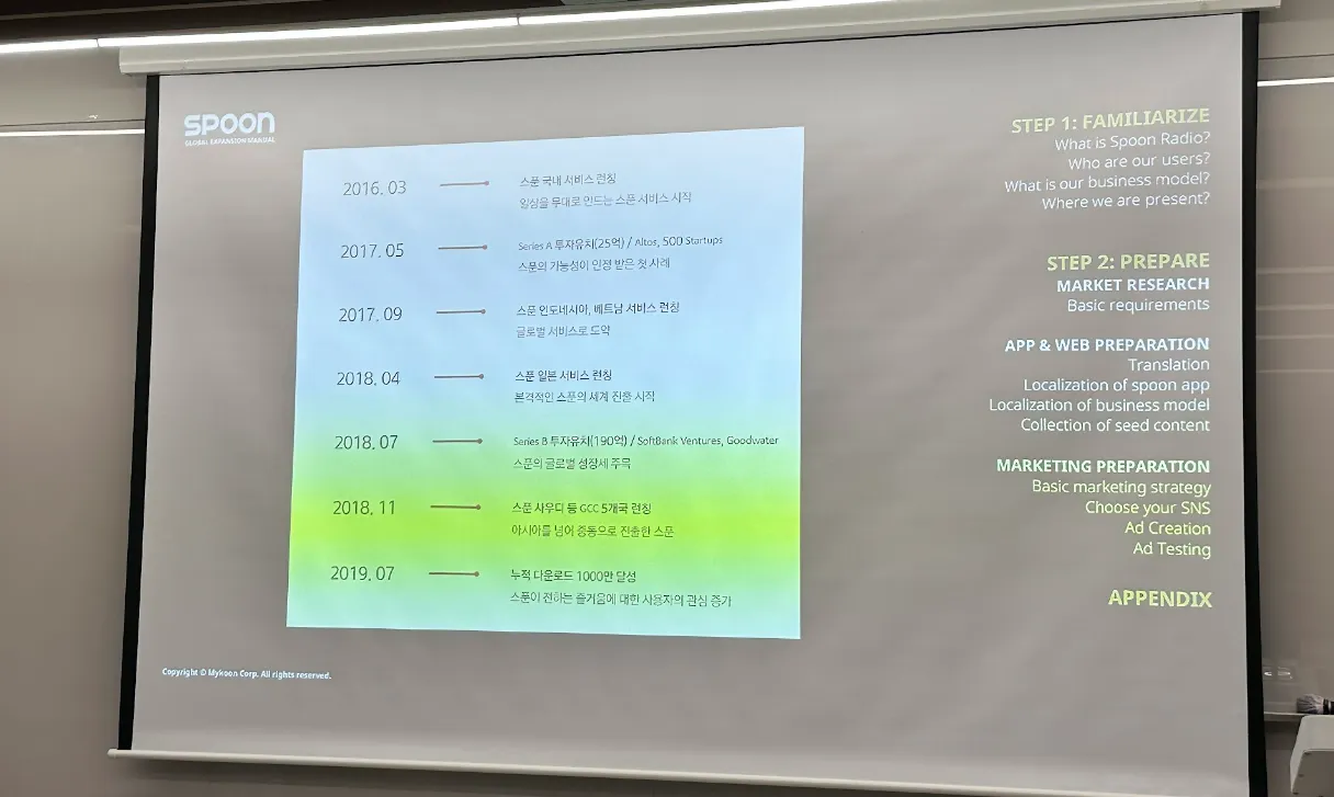 당시 스푼이 시리즈A(25억) 투자를 받을 수 있었던 이유는 명확합니다. 한국에서 매달 2배씩 성장하는 성장세가 있었기 때문입니다. 2016년 10월부터 2017년 2월까지, 투자자들이 먼저 저희 사무실 문을 두드리는 걸 경험할 정도로 가파른 성장세와 매출의 지표가 있었기 때문에 해외 진출 역시 고려할 수 있었습니다. 즉, 한국에서 전개하는 비즈니스 자체의 성과 없이 해외 진출을 고려하고 계시다면 성공 확률은 낮을 수밖에 없습니다. 국내에서 의미 있는 성과를 만든 후 해외 시장을 공략하시길 바랍니다.