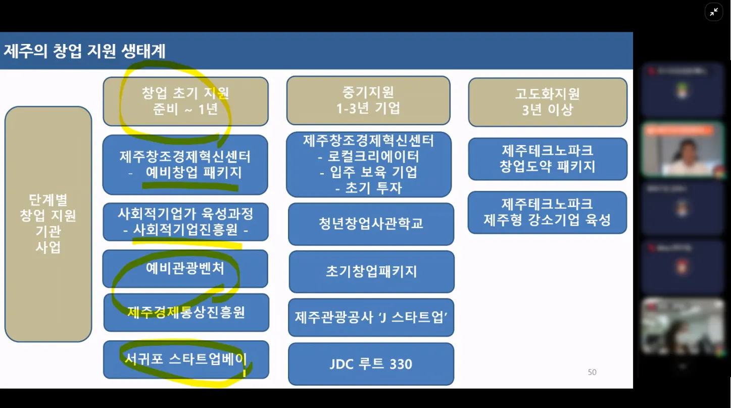 모두가 강의실에 둘러 앉아 제주 창업 생태계에 대한 이야기를 들었습니다.