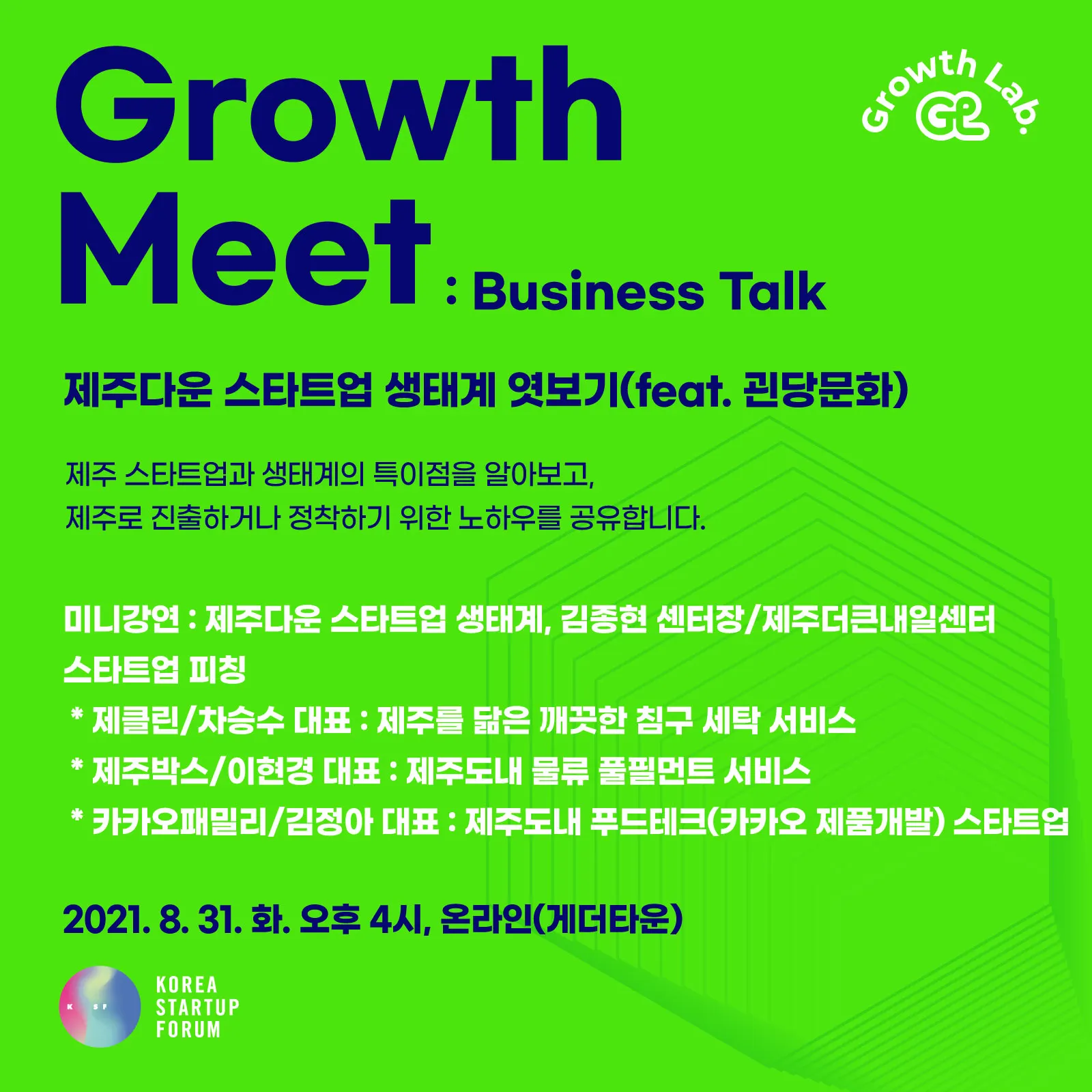 코리아스타트업포럼 'Grwoth Meet : Business Talk 제주편' 프로그램은 강연과 피칭 프로그램을 통해 제주 스타트업 생태계와 그 특이점을 알아보고, 제주 진출 의사가 있는 회원사의 비즈니스 교류를 돕는 목적으로 기획되었습니다!
