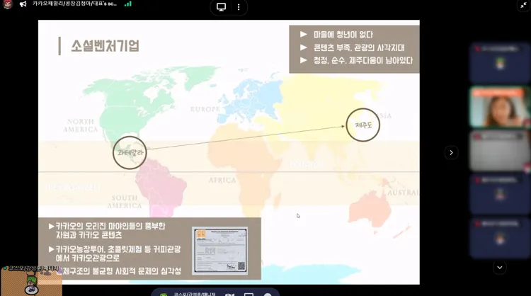 제주 기업의 마지막 순서는 '제주도내 푸드테크 소셜벤처기업' 카카오패밀리의 김정아 대표였습니다! 로컬 크리에이터 기업으로, 지속 가능한 공동체를 위해 지역의 자원을 발굴하고 있는데요. 과테말라 마야인들의 자립을 위해서 부족의 카카오를 이용해, 푸드를 생산하고 있다고 합니다. 사회 및 경제적인 문제를 발견하면서 이를 해결하기 위해 많은 노력을 기울이시는 모습에 참가자 모두가 감동 받았다고 하네요!