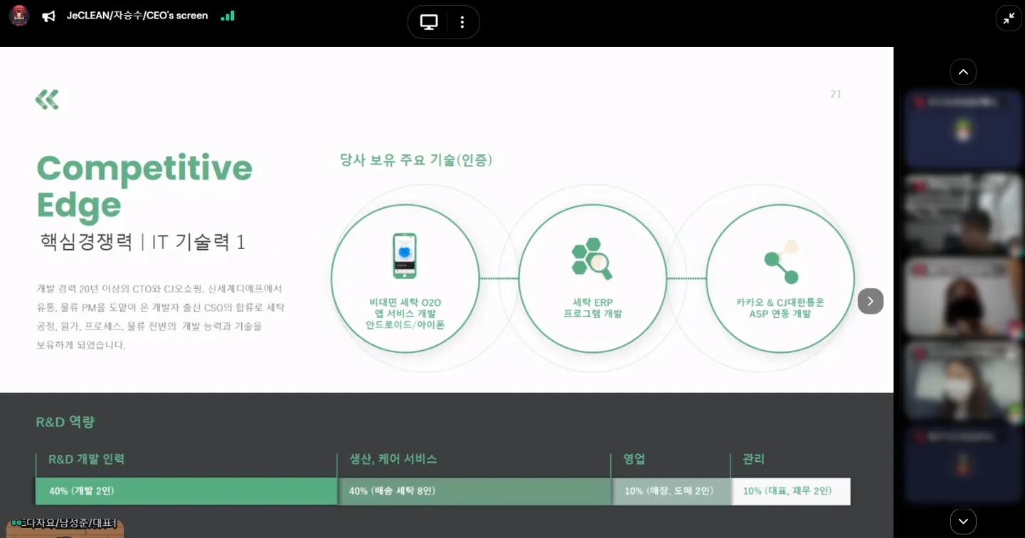 다음은 제주 소재 기업의 피칭 시간이었습니다. 총 3개 기업의 발표가 있었는데요. 첫 타자는 '제주를 닮은 깨끗한 침구 세탁 서비스' 제클린의 차승수 대표께서 맡아주셨습니다. 외지인으로서의 생생한 제주 정착기와 세탁업의 IT기술 접목기를 들을 수 있었어요!