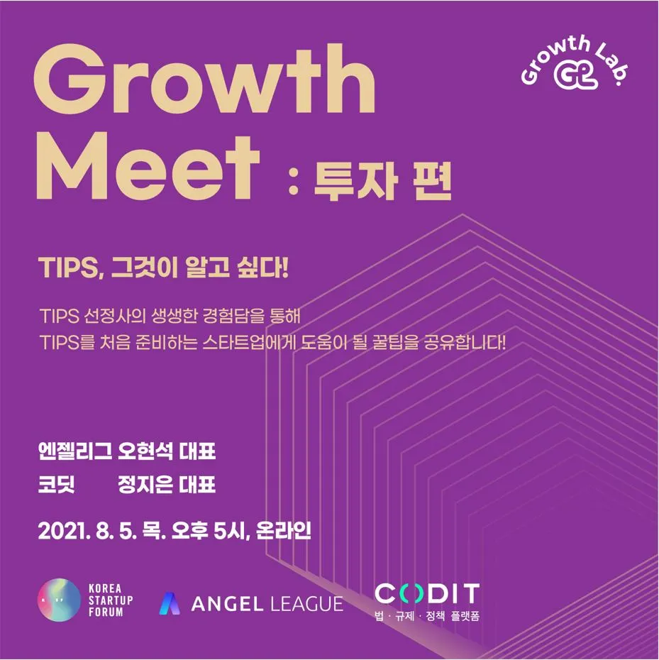 지난 2021년 8월 5일, 'Growth Meet : TIPS, 그것이 알고 싶다!' 편이 진행되었습니다. 이번 Growth Meet은 TIPS 선정사인 '안전한 스타트업 비상장 주식 거래 플랫폼-엔젤리그'와 '법규제 및 정책 데이터 지능 플랫폼-코딧'의 TIPS 프로그램 경험담 공유를 통해 평소 TIPS에 대한 궁금증을 해결할 수 있었던 시간이었는데요. 엔젤리그의 오현석 대표, 코딧의 정지은 대표 그리고 코리아스타트업포럼 회원사가 함께 했습니다. (TIPS에 대한 고민이 많은 회원사들의 열렬한 관심으로 오픈 30분 만에 선착순 마감되었다는 후문이..!