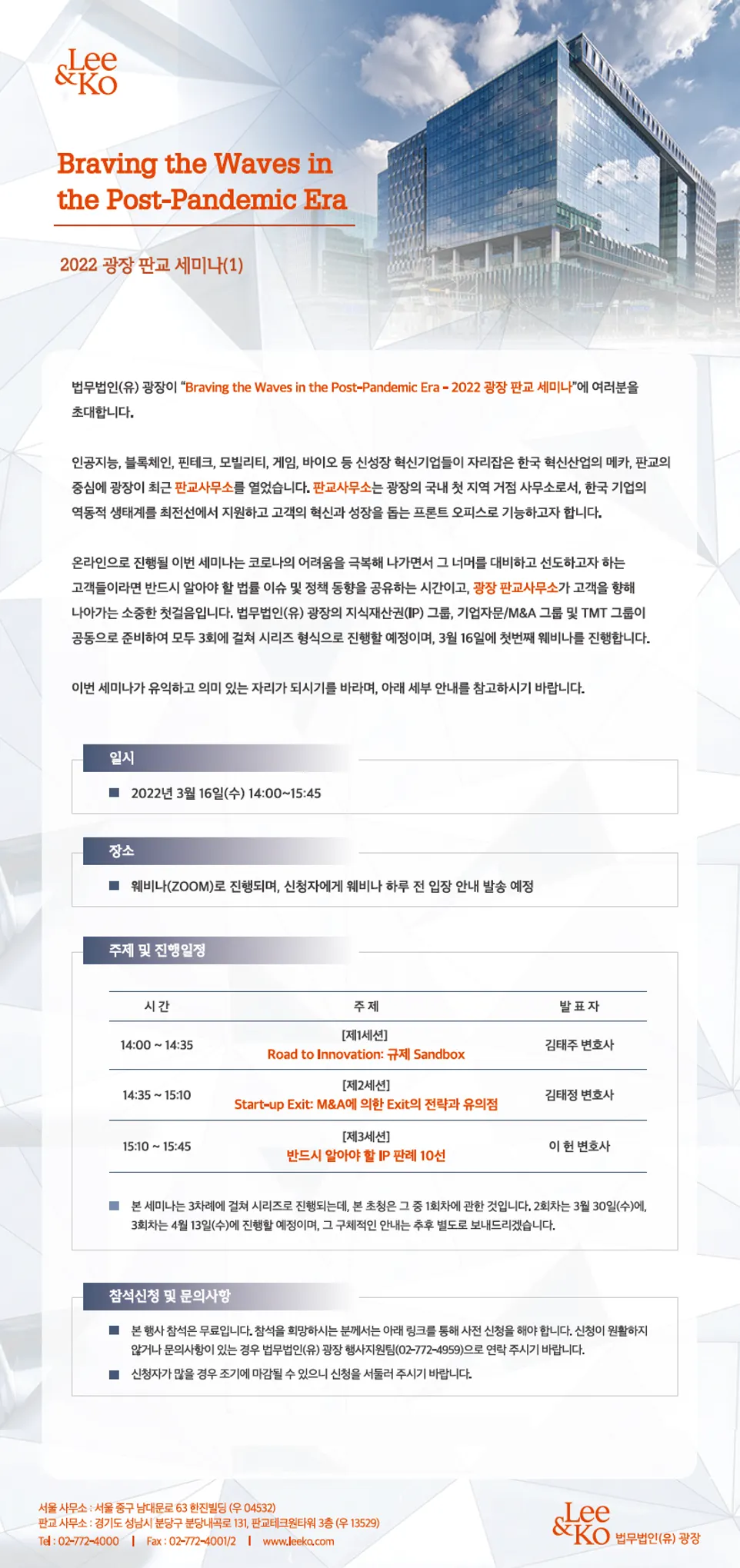 본 세미나는 3차례에 걸쳐 시리즈로 진행되며, 2회차, 3회차 참가신청은 법무법인(유) 광장 홈페이지 통해 안내될 예정입니다.