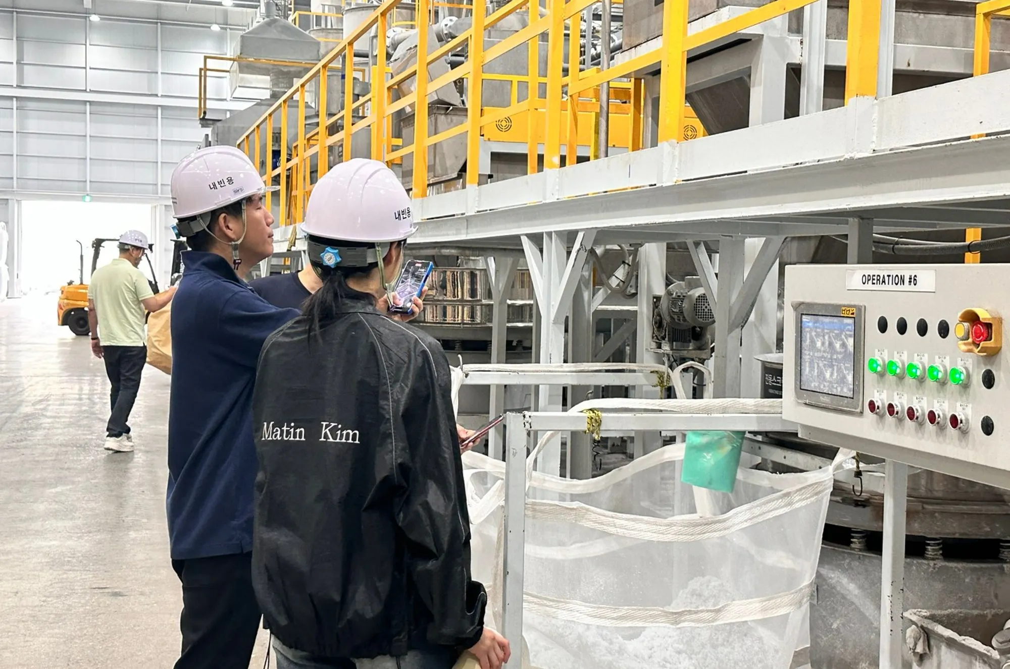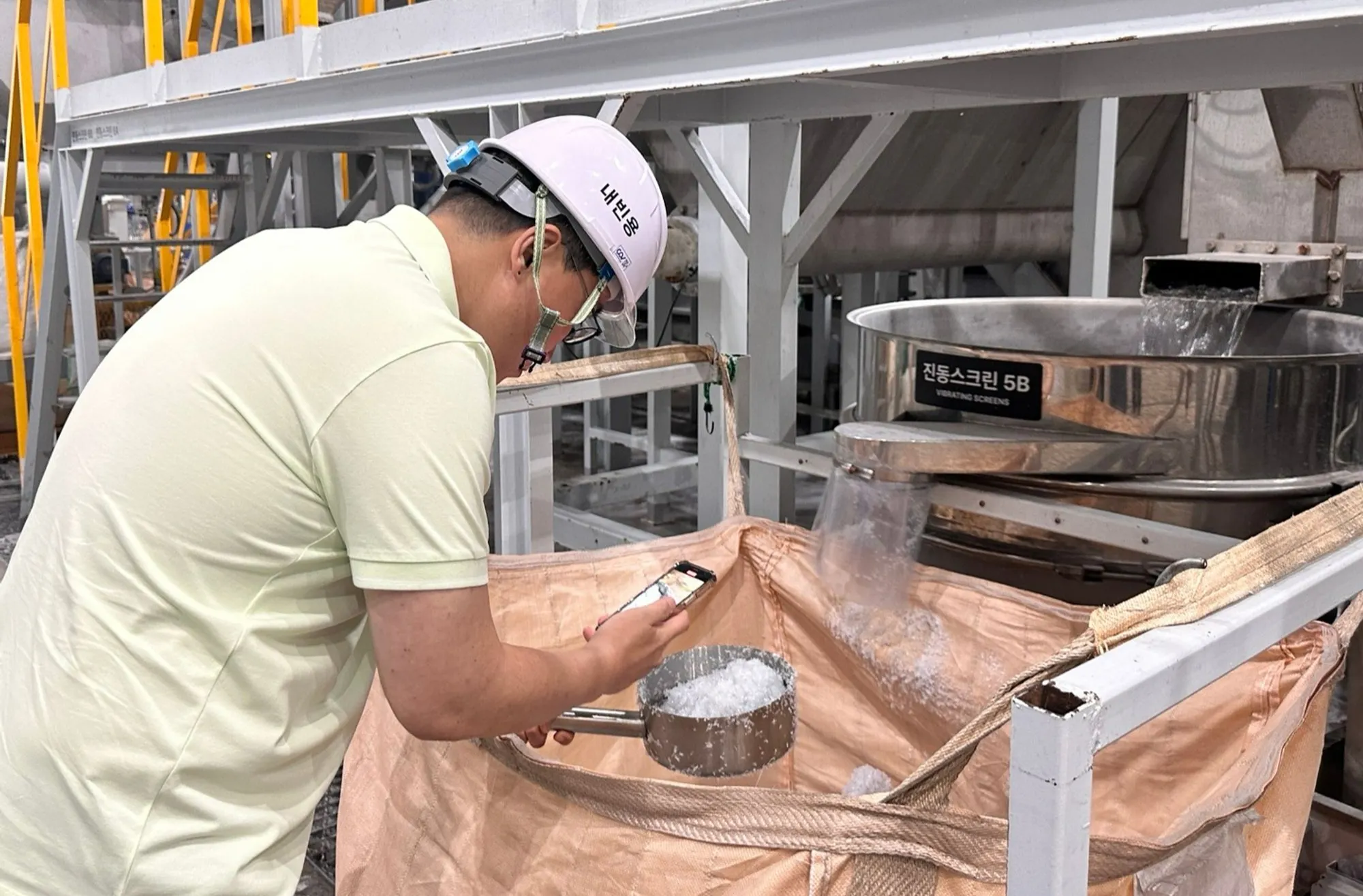 선별된 PET병이 잘개 쪼개어져 r-PET Flake로 거듭나기까지 수많은 PET병이 컨베이어 벨트 위로 끝없이 이어졌어요. 쪼개어진 r-PET Flake를 보석 감정하듯 만져보는 우리 대표님들 :)