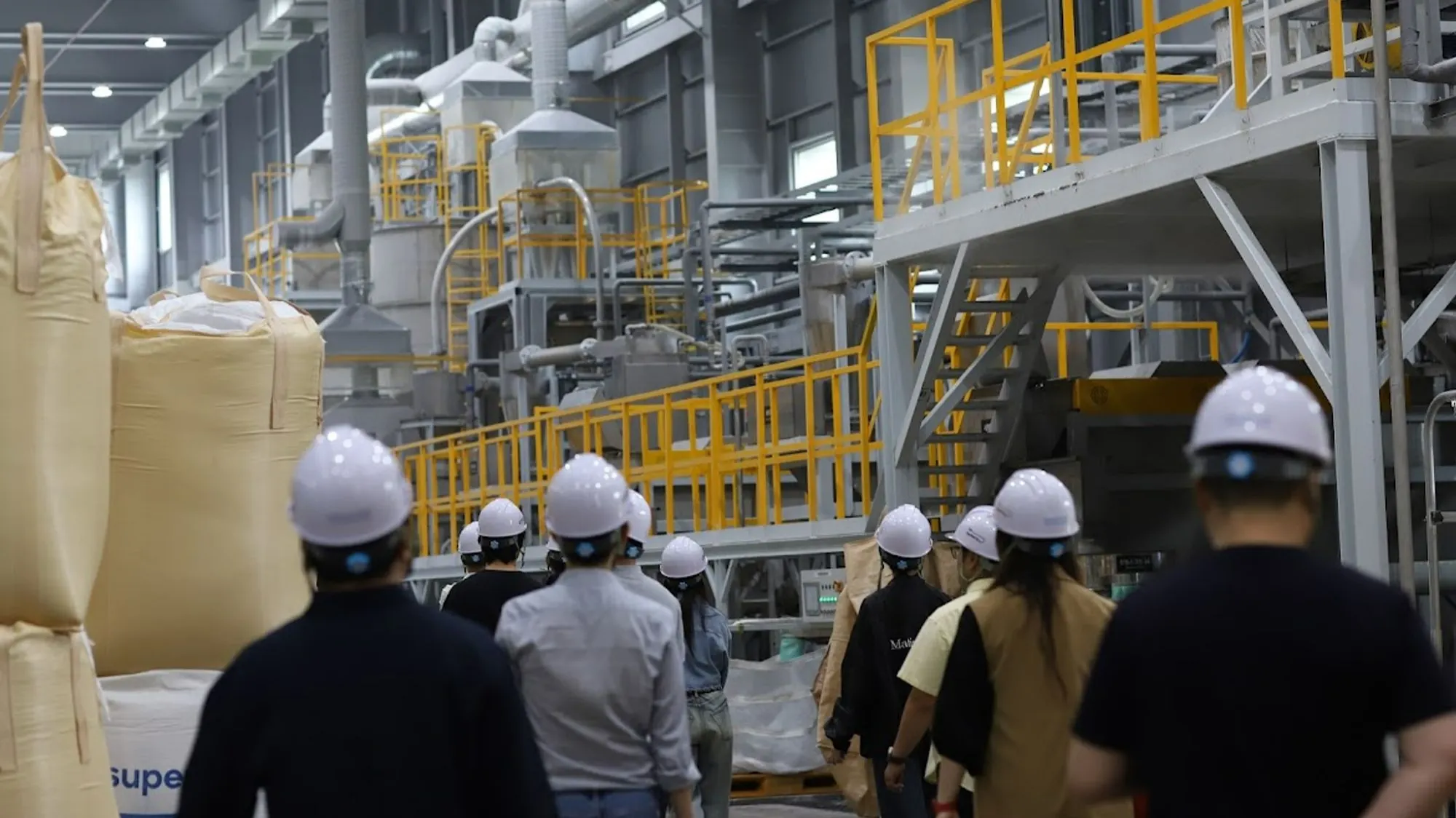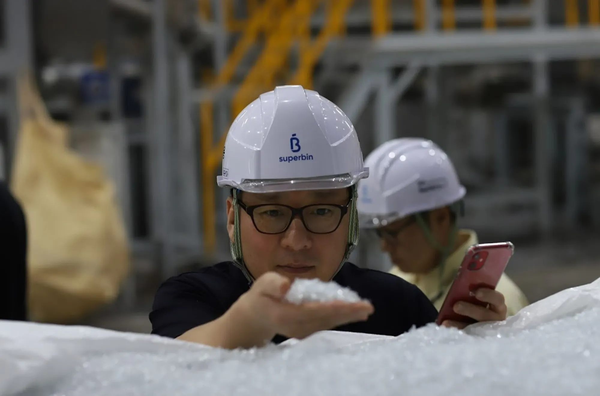 1층의 공장 설비를 한눈에 볼 수 있는 구조로 기존의 폐기물 시설과 어떤 차별점이 있는지 직접 확인할 수 있었습니다. 수퍼빈만의 폐기물 관리 방식을 통해 재활용이 가능한 자원을 선별하고 수집합니다. 선별된 PET병이 아이엠팩토리에 들어와 r-PET Flake로 바뀌게 되면서 버려진 폐기물에서 소재화가 되기까지의 공정과정을 확인할 수 있었습니다.