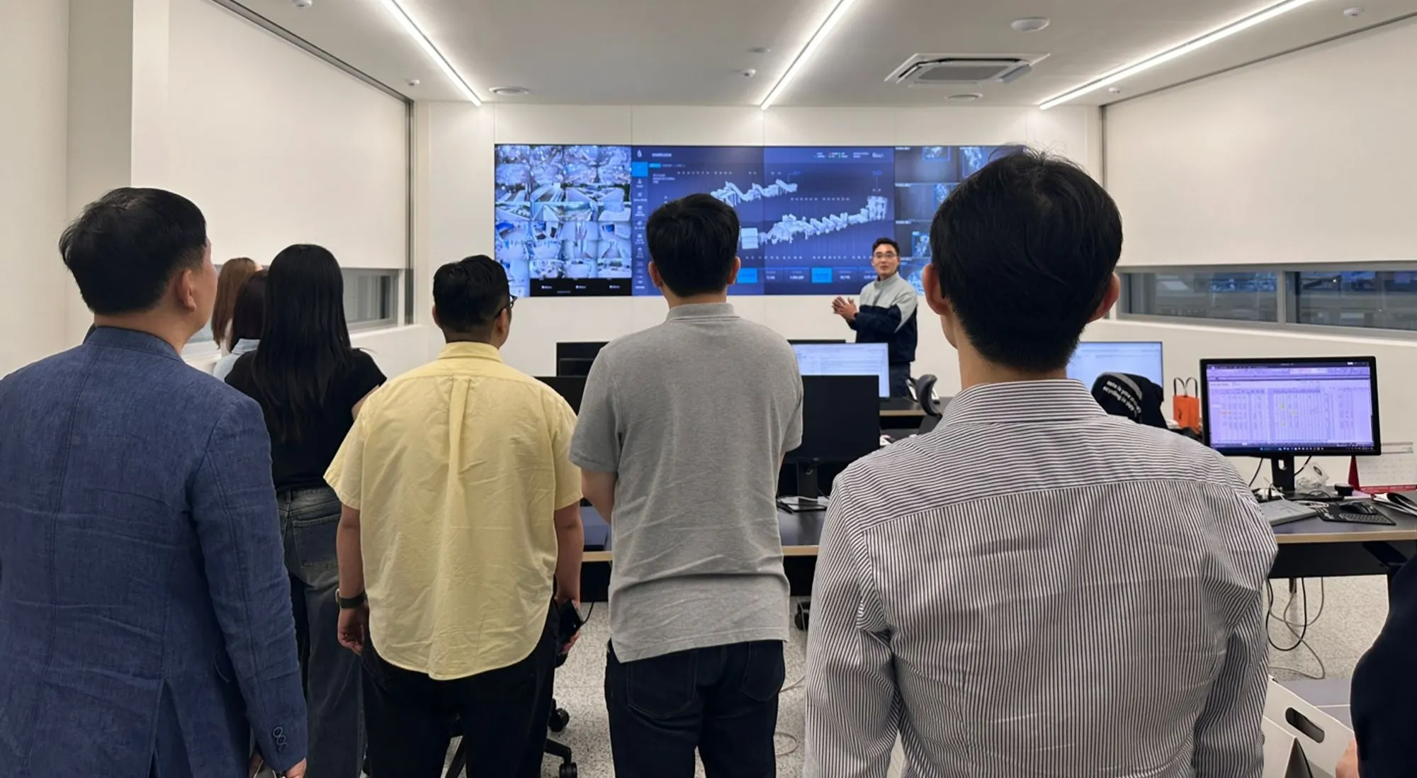 2층에는 전체 공정을 한눈에 확인할 수 있는 통합운영실이 있었습니다. 중앙에 위치한 대형 스크린을 통해 전 공정의 기계 가동상태를 실시간으로 모니터링하고, 가로로 길게 배치된 창을 통해 작업자의 상황을 확인할 수 있었어요.