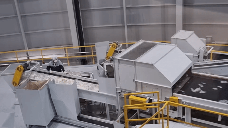 드디어 1층 공장에 내려왔습니다. 공장에는 일상 속에서 소비되고 버려진 PET병이 재생 가능한 r-PET Flake로 만들어지기까지 필요한 각종 설비를 토대로 한창 공정이 진행 중이었습니다.