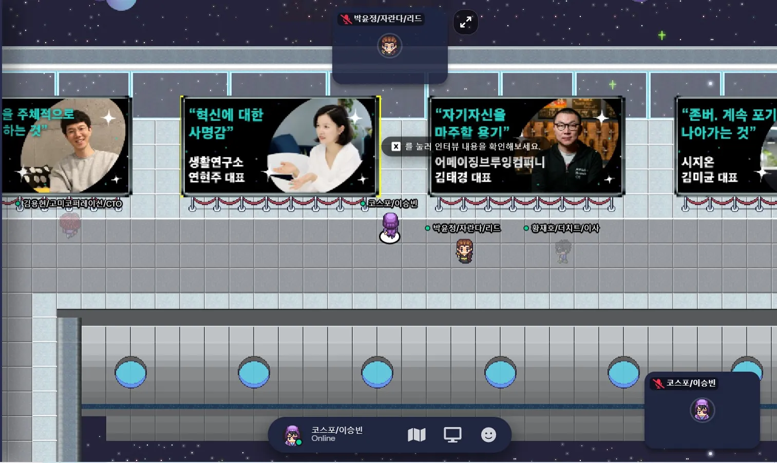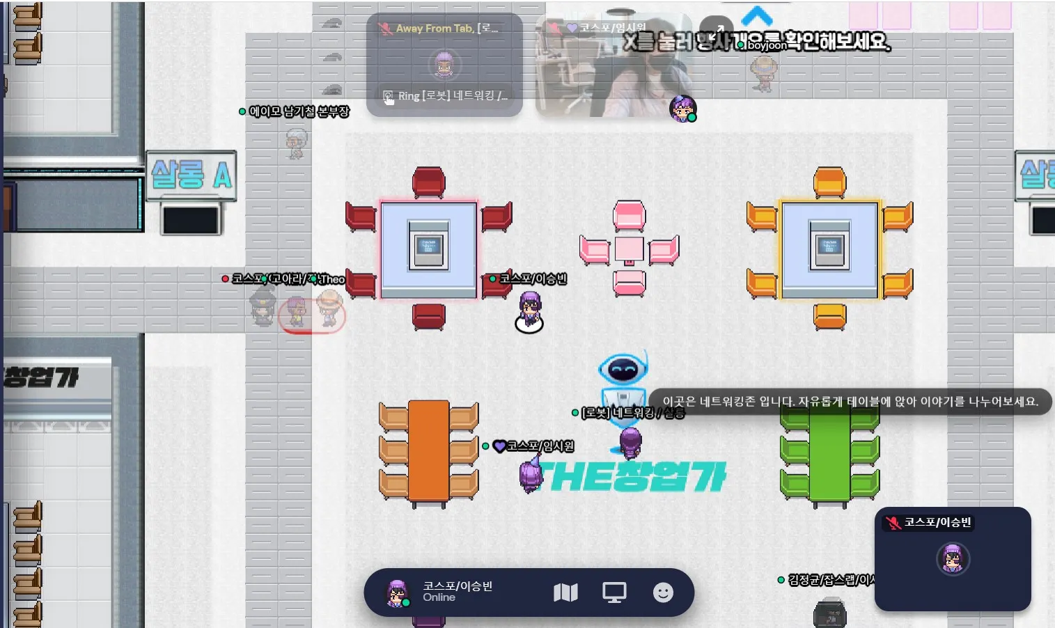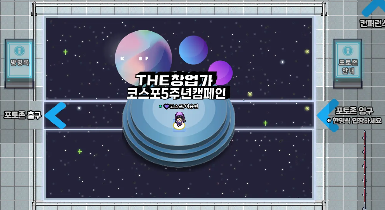 : 오픈 컨퍼런스에 이어, 코스포 회원사를 위해 마련된 특별한 네트워킹 시간! 바로 회원사만을 대상으로 게더타운에서 오픈된 THE창업가 페스티벌입니다. 우주로 쏘아 올려진 [THE창업가]호의 내부를 살짝 공개합니다.