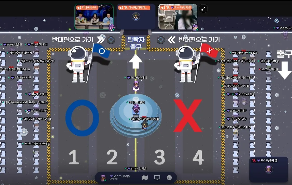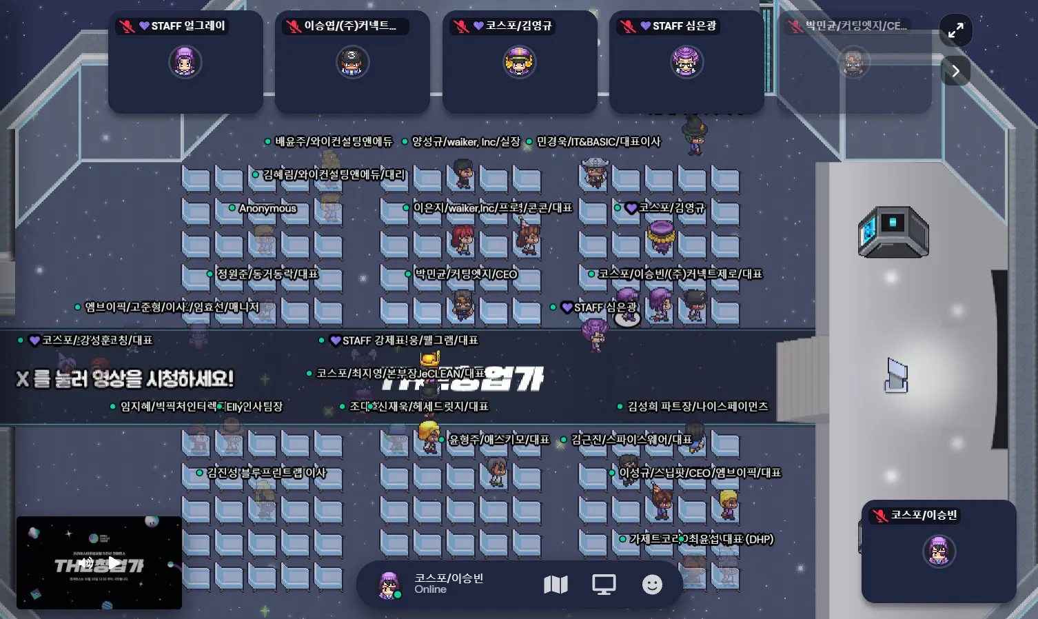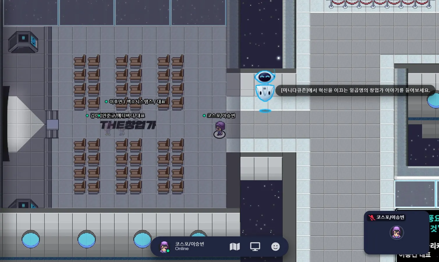 : 오픈 컨퍼런스에 이어, 코스포 회원사를 위해 마련된 특별한 네트워킹 시간! 바로 회원사만을 대상으로 게더타운에서 오픈된 THE창업가 페스티벌입니다. 우주로 쏘아 올려진 [THE창업가]호의 내부를 살짝 공개합니다.