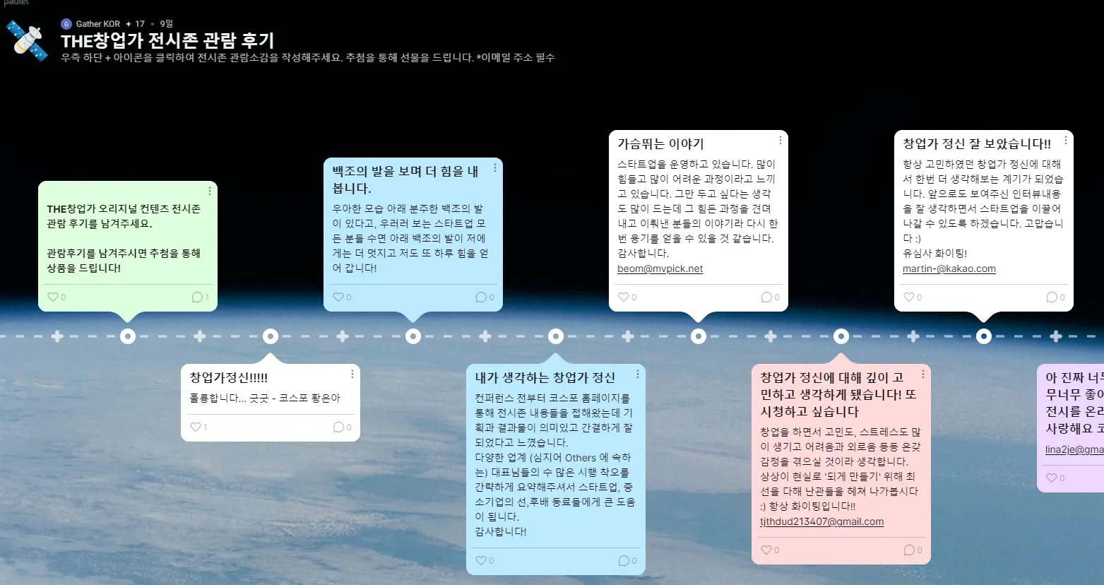 전시관 출구에는 관람 후기를 남길 수 있는 관람 후기 게시판이 준비되었습니다. 전시를 통해 마음의 위로를 받은 창업가, 감상 후 팀원들과 과거의 희로애락을 나누는 등의 소중한 이야기가 담겨져 있어요!