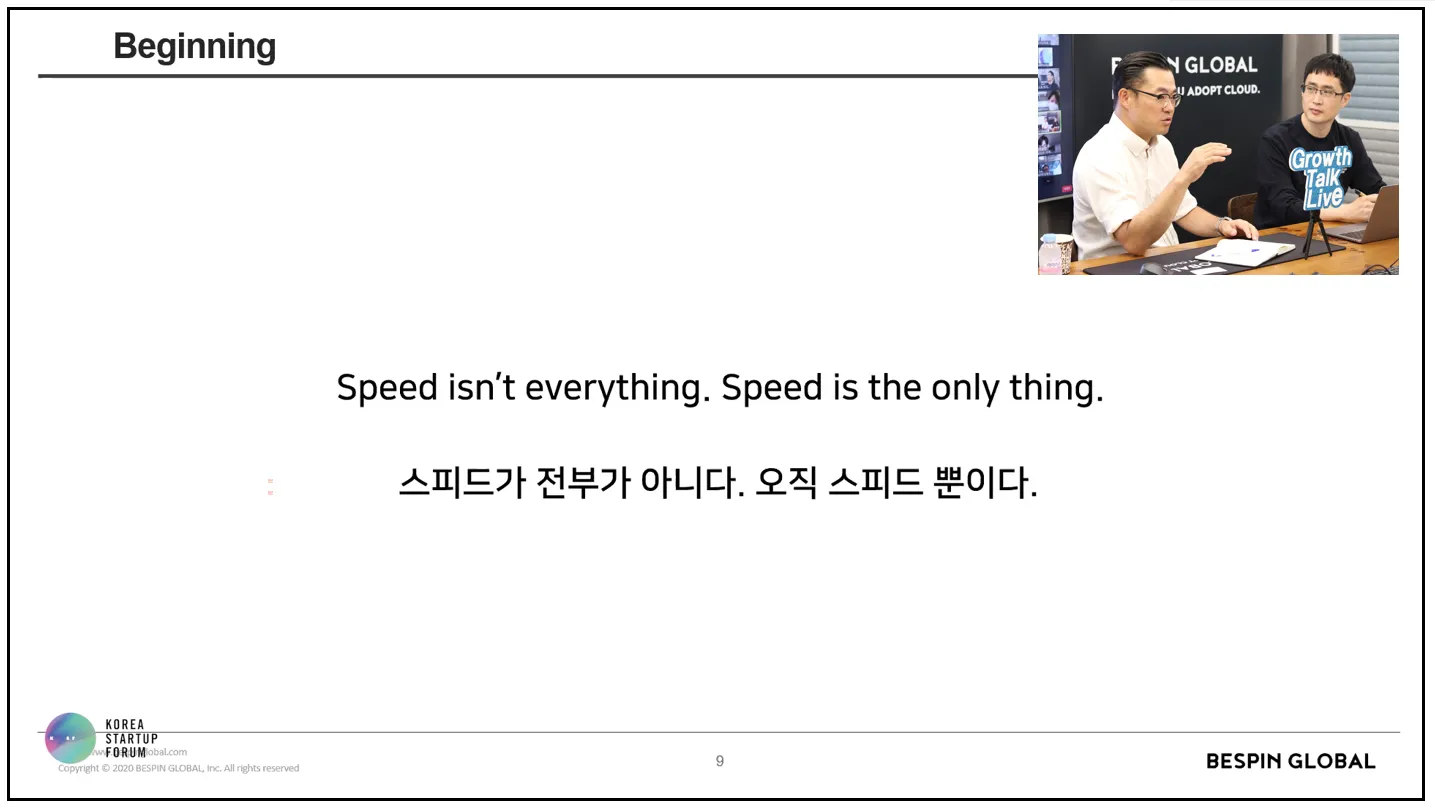 남들이 보기에 ‘저걸 어떻게 저 시간에 해냈지?’라고 생각할 만큼의 속도가 나와야 하고, 스피드가 중요한 게 스타트업을 하게 되면 실수를 많이 할 수 밖에 없어요. 실수를 했을 때 빨리 수정을 해야 해요. 코로나로 예를 들면 예측 가능했던 사태가 아니었어요. 이랬을 때 우리가 살아남을 수 있는 방법은 스피드뿐이 없어요. 남들이 하루에 할 때 우리는 5초 안에 해야 하고, 남들이 5초 안에 하면 우리는 실시간으로 해야 해요.