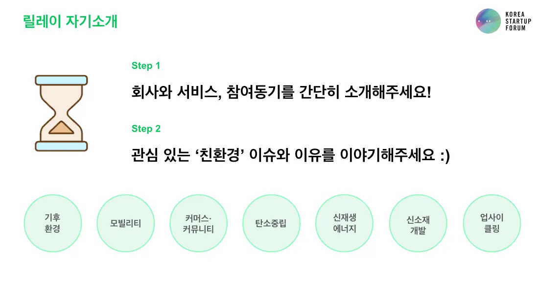 기후·환경, 모빌리티, 커머스·커뮤니티, 탄소중립, 신재생에너지, 신소재 개발, 업사이클링 등 스타트업별로 관심 있는 친환경 이슈들이 다양했어요!