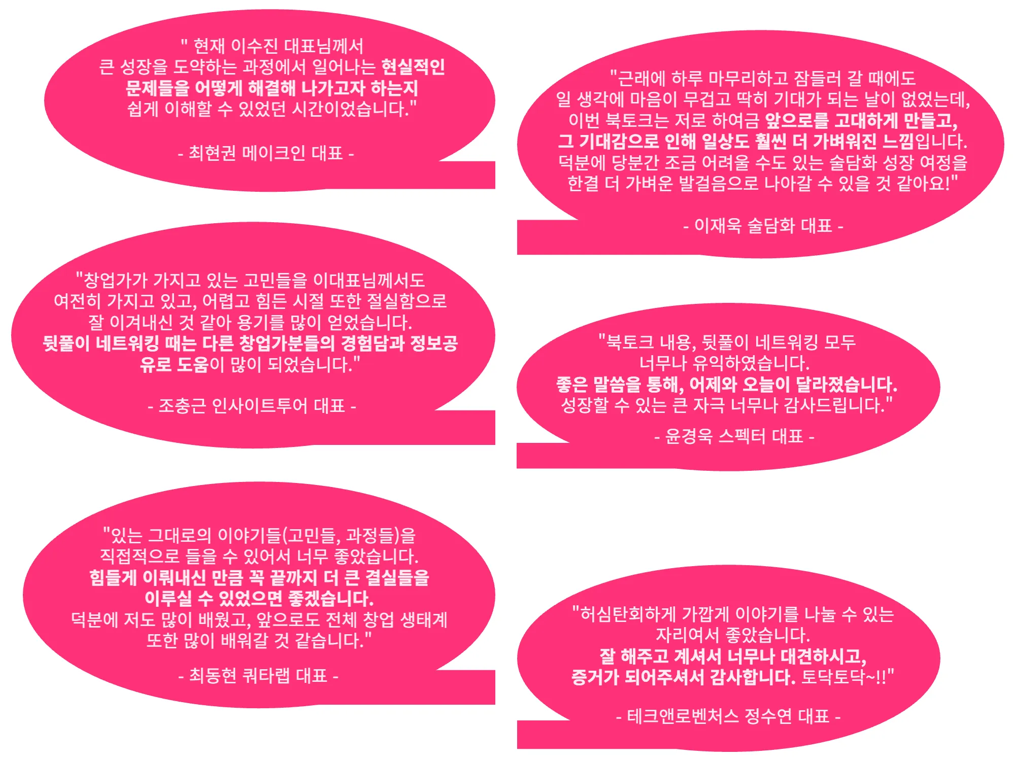 코스포는 이번 북토크처럼 스타트업 창업가가 경험과 역량을 나누고 Pay it Forward를 실천하는 커뮤니티 문화를 만들어가고 있어요! ‘1:1 오피스아워’, ‘창업가토크룸’, ‘창업가워크숍’ 등 프로그램을 통해 경영부터 조직문화, 멘탈 헬스케어까지 다양한 영역에서 창업가간 상호 성장을 돕고 연대를 강화하려고 노력 중이니, 여러분도 많은 관심 부탁드려요!