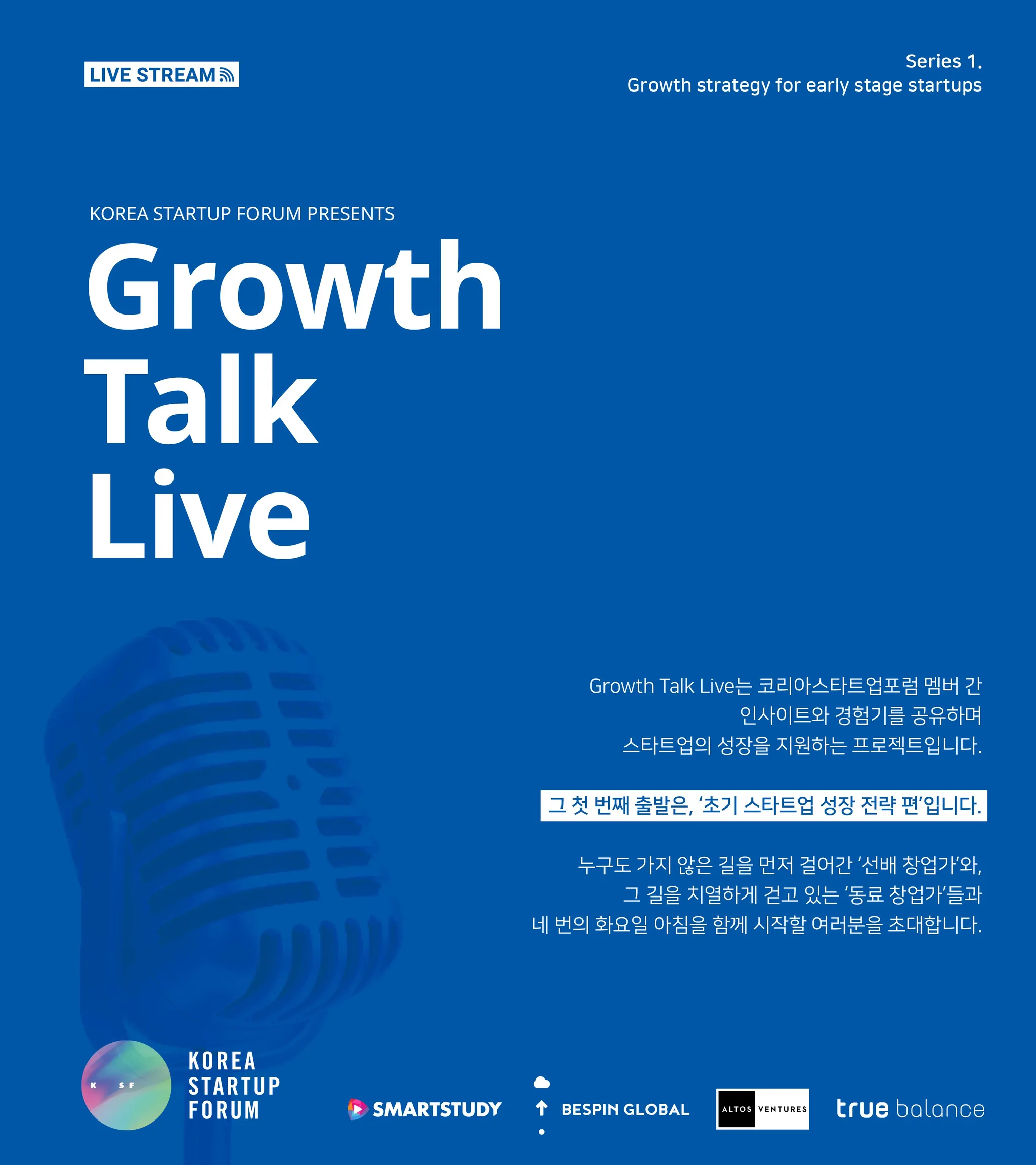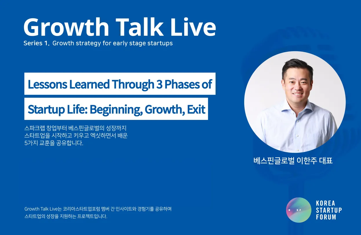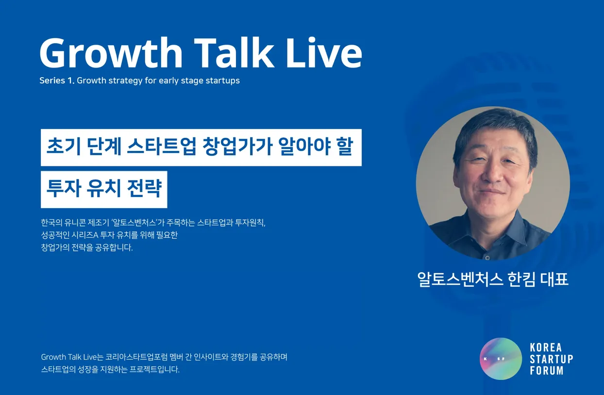 창업 초기부터 시리즈 A 투자유치 전 단계에 있는 초기 창업가들의 역량 증진에 필요한 브랜딩, 투자유치, 해외진출 을 주제로, 창업가와 VC의 성장과정 경험을 공유하는 Growth Talk Live!
