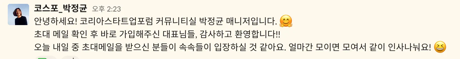 안녕하세요! 코스포 스타트업커뮤니티성장실 박정균입니다. :)