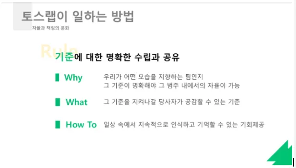 상황에 대한 인지 후에는 기업의 공정한 룰을 구성원들이 모두 인지할 수 있도록 하는 장치가 필요한데요. 이는 게임의 룰이 공정한 것을 알면 게임에 몰입할 수밖에 없는 것처럼, 구성원들이 기업의 룰이 공정하다는 것을 알게 함으로써 업무 몰입이 가능하고, 이를 통해 스스로 동기부여가 가능하기 때문이라고 합니다. 이를 위해 1) 기준(Rule)을 명확하게 수립하고 2) 정기적으로 투명하게 토스랩의 문화를 공유한다고 합니다. 그 예로 월 1회 타운홀 미팅, 매주 월요일에 진행되는 weekly 전사 미팅 등의 장치들을 통해 토스랩의 문화가 자연스럽게 녹여들 수 있다고 합니다. 김대현 대표는 조직문화가 자연스럽게 녹여들었기 때문에 대표나 다른 사람이 직접적인 관여를 하지 못하는 상황에서도 각자의 동기부여가 가능할 수 있음을 강조했습니다.
