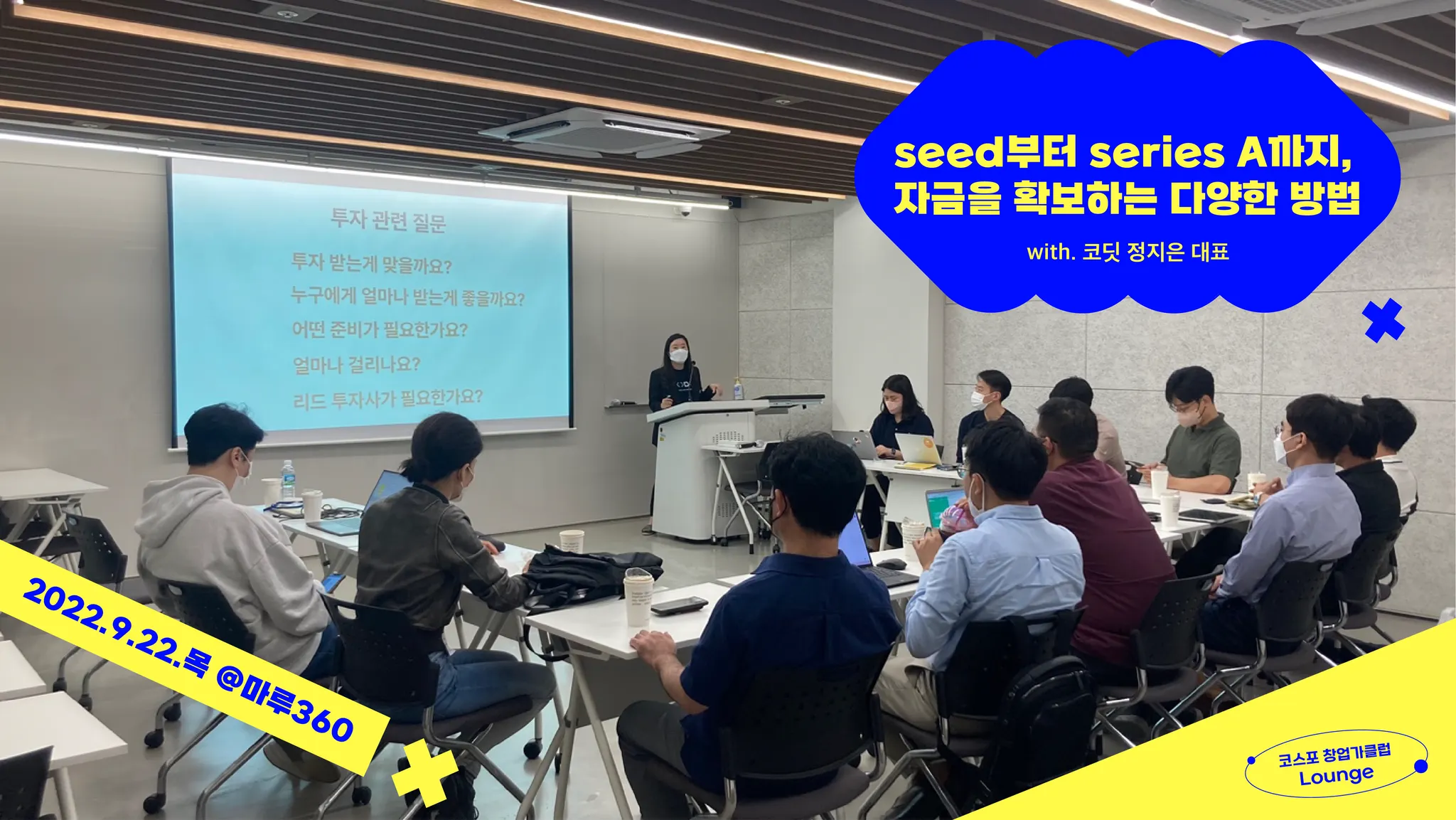 지난 9월 22일 마루360 성장 세미나룸에서 진행된 대망의 창업가클럽 그 첫번째 토크룸은 seed부터 pre-A를 위한 비기너 라운지로, “초기 기업이 자금을 확보하는 다양한 방법 - 투자받을 결심”에 대해 이야기 나누었습니다.