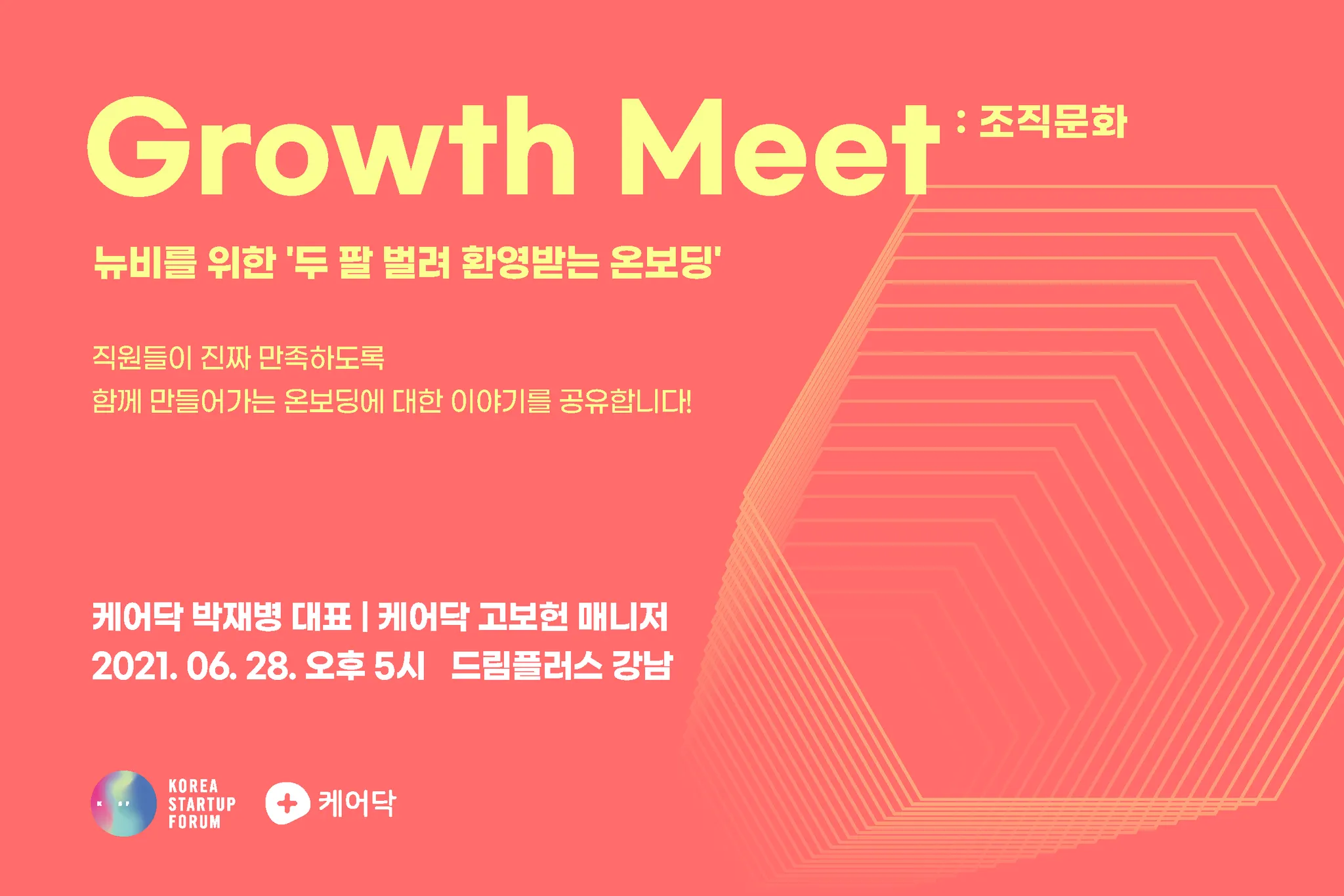 지난 2021년 6월 28일, 'Growth Meet : 뉴비를 위한 '두 팔 벌려 환영받는 온보딩'이 드림플러스 강남에서 진행되었습니다. 이번 Growth Meet은 '대한민국 1등 실버케어 스타트업 - 케어닥'의 온보딩을 소개하고 이와 관련한 궁금증을 해결하는 시간으로 구성되었는데요. 케어닥의 박재병 대표, 고보헌 매니저 그리고 코리아스타트업포럼 회원사가 함께 했습니다.