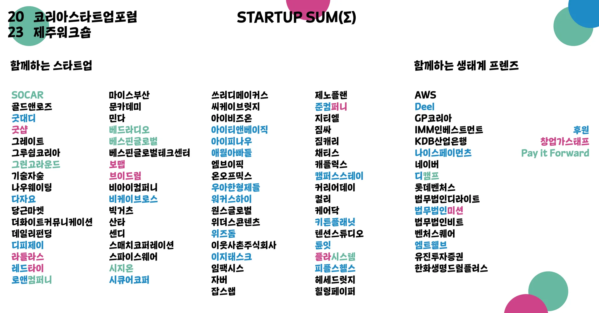 2023년 9월 14일~16일, 제주시 일대에서 코리아스타트업포럼 2023 제주워크숍이 2박3일 간 진행되었습니다. 코스포 패밀리의 사랑을 듬-뿍 받아온 <제주워크숍>. 올해는 82개 사 92명과 함께했어요!