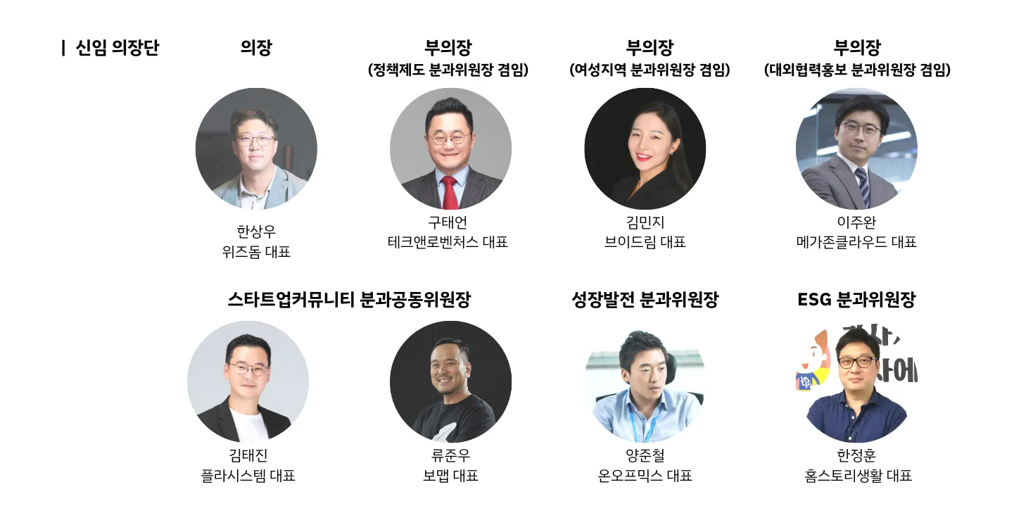 또한 창업가 커뮤니티 활성화를 위해 6개의 분과가 신설되었는데요. ‘스타트업커뮤니티’, ‘대외협력홍보’, ‘성장발전’, ‘정책제도’, ‘ESG’, ‘여성지역’ 6개로, 각 분과위원장은 류준우 보맵 대표와 김태진 플라시스템 대표(공동), 이주완 메가존클라우드 대표, 양준철 온오프믹스 대표, 구태언 테크앤로벤처스 대표, 한정훈 홈스토리생활 대표, 김민지 브이드림 대표가 맡았습니다.