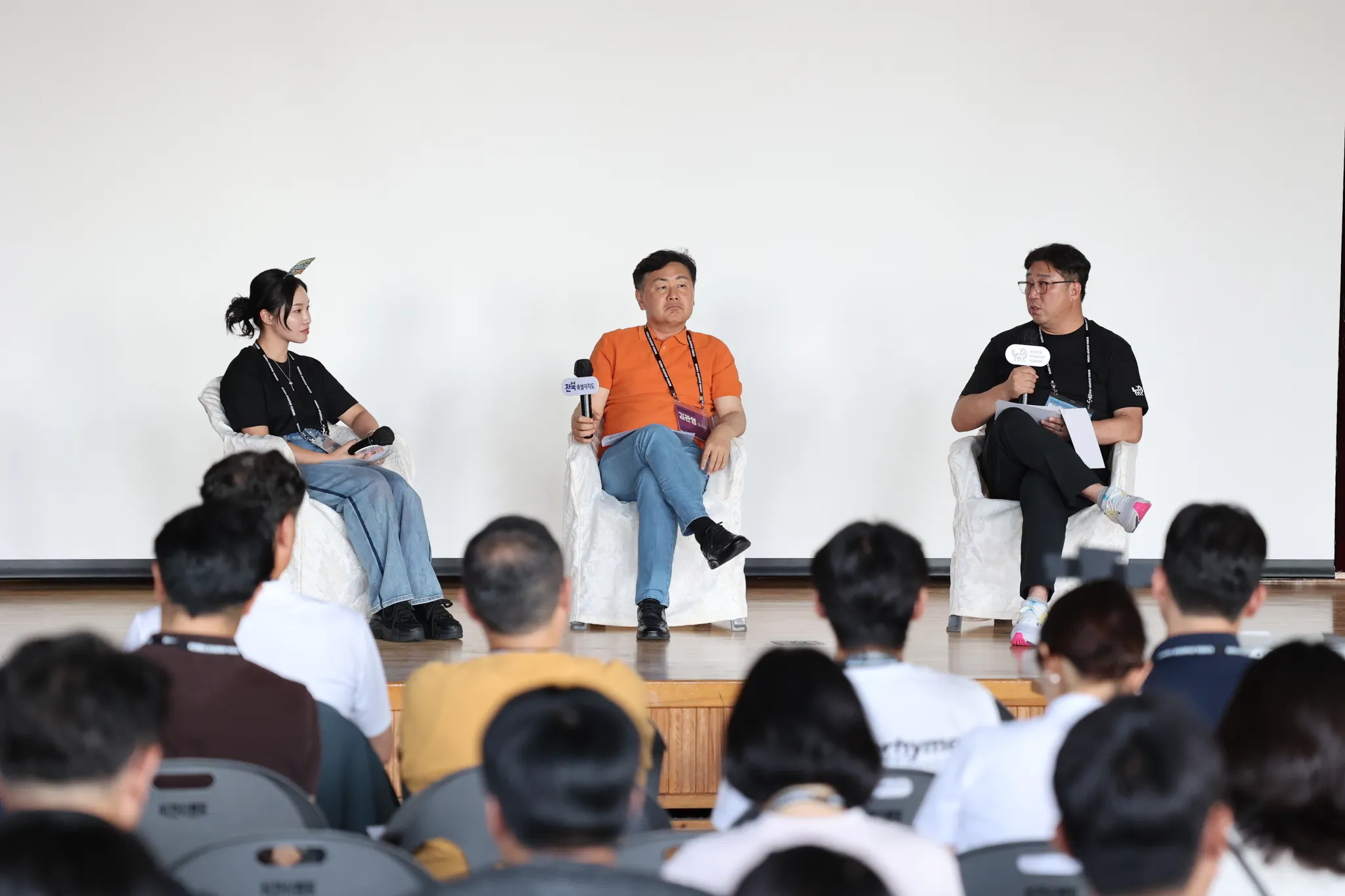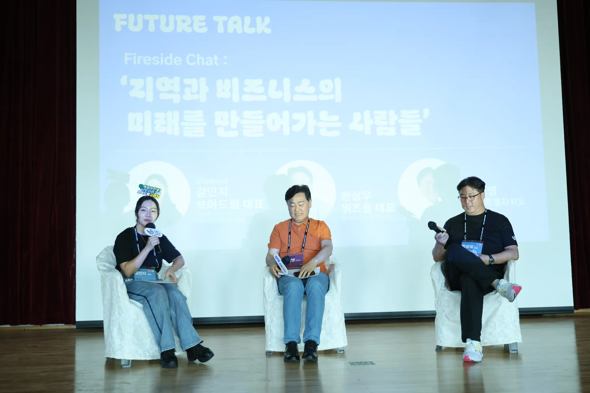 안녕하세요. 저는 브이드림 대표 김민지라고 합니다. 이번 Fireside Chat <지역과 비즈니스의 미래를 만들어가는 사람들> 세션의 모더레이터를 맡았습니다. 김관영 지사님, 한상우 의장님 반갑습니다.