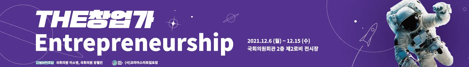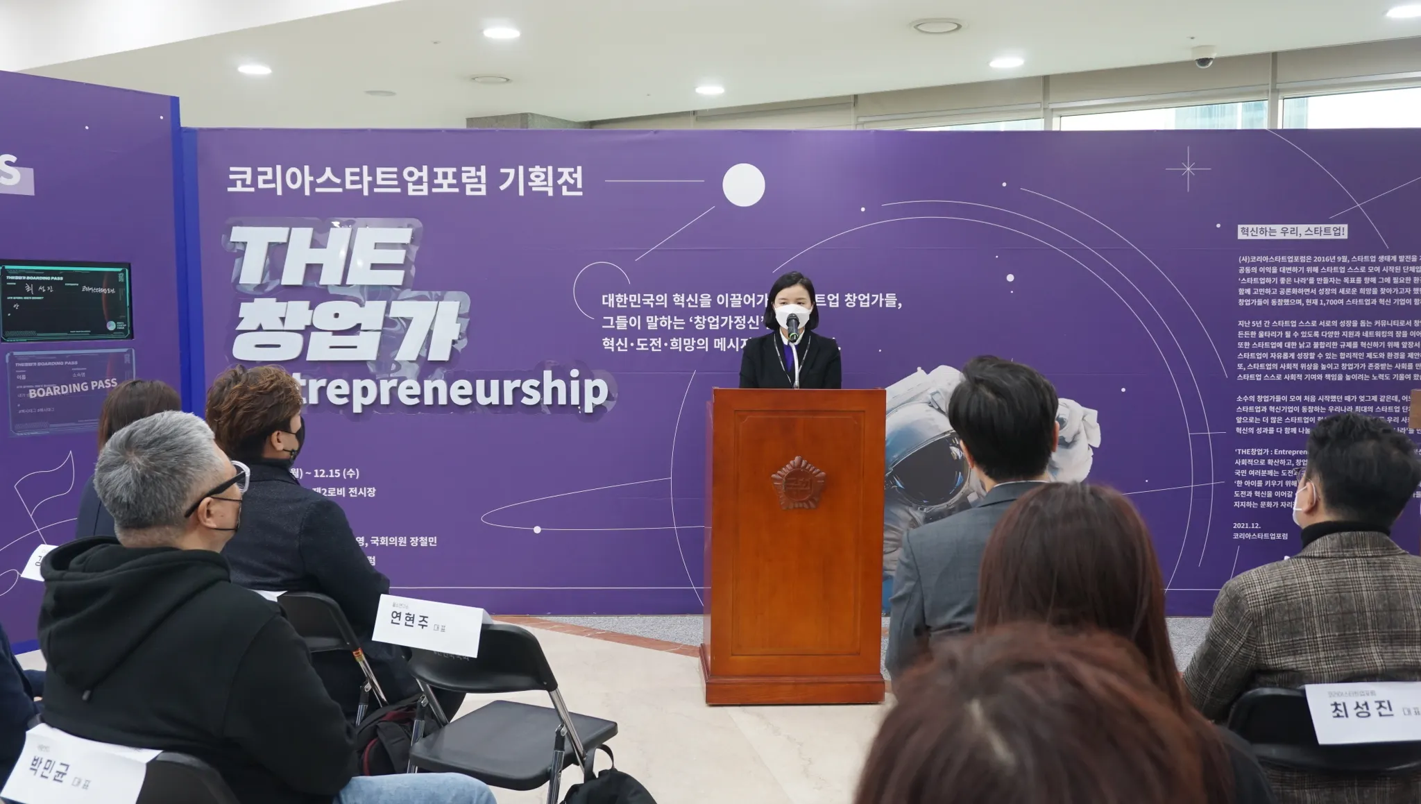 2021년 12월 6일 코리아스타트업포럼 기획전 'THE창업가 : Entrepreneurship'이 국회의원회관에서 개최되었습니다. 코스포와 이소영 국회의원, 장철민 국회의원이 공동 주체한 이번 기획전은 '창업가정신'을 조명하고 사회적으로 확산하기 위해 추진된 THE창업가 캠페인의 일환으로 진행되었습니다.