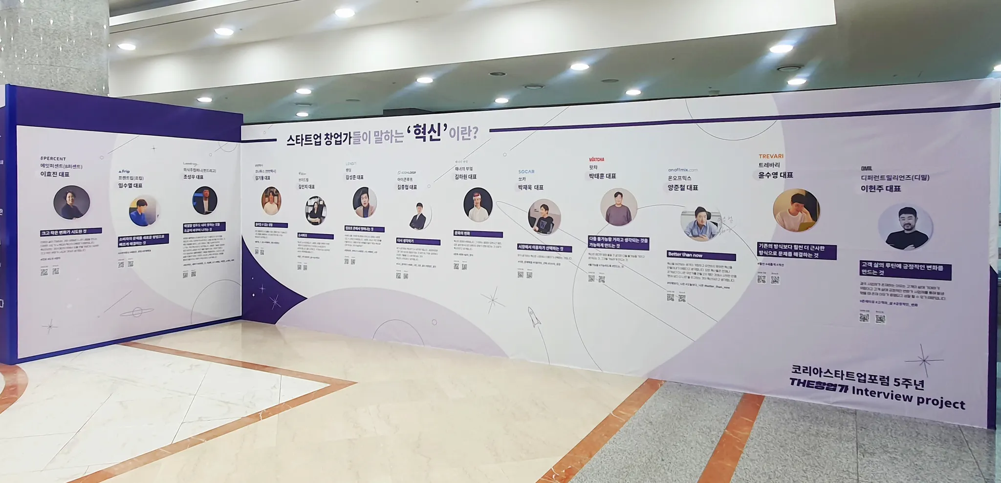 코스포가 진행한 이번 인터뷰 프로젝트는 창업가들의 창업가정신을 끌어내기 위해 고민하여 만든 질문지에 대표님들이 직접 답변 하셨기 때문에 어느 미디어에서도 보지 못하는 창업가들의 살아있는 이야기를 담을 수 있었습니다. 현장에서는 준비된 큐알코드를 통해 인터뷰 전문과 해당 창업가가 창업한 스타트업에 대한 정보를 볼 수 있어 더욱 풍성한 볼거리를 제공하였습니다.