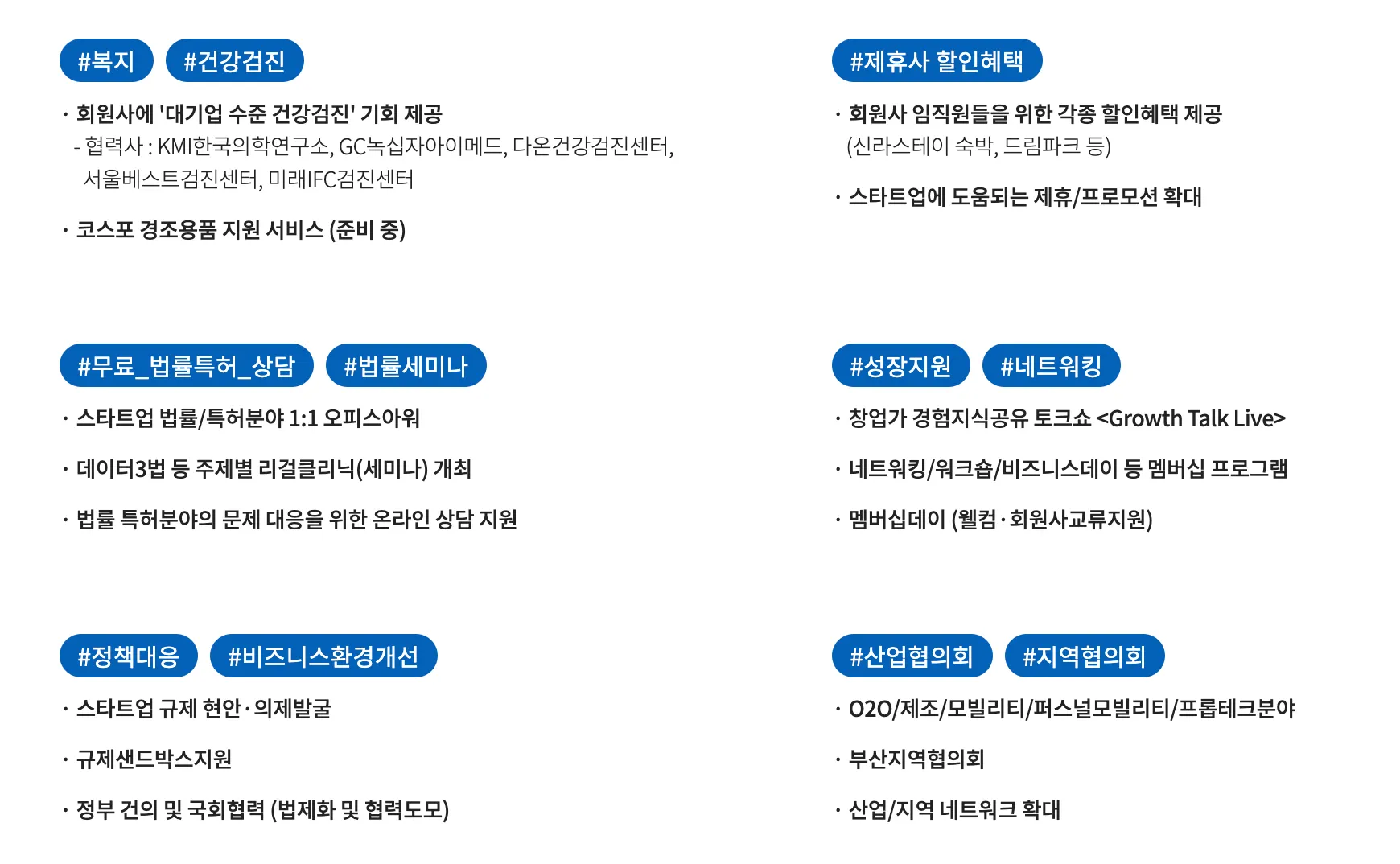 · 스타트업 비즈니스 환경 개선을 위한 정책활동 : 규제발굴 및 정책대응, 규제샌드박스지원 등